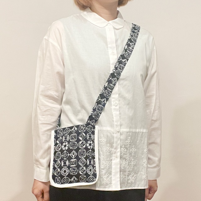 diamondのテキスタイルのミニショルダーバッグ。表面は刺繍生地、裏面は無地です。 内側にはロゴが縫い付けてあります。 生地が2重になっており、持ち手には芯が貼ってあり丈夫なつくりです。 縁にはテープで囲った、シンプルなデザインの小さなショルダーバッグです。 携帯電話や鍵など、貴重品だけを入れて使うのがおすすめです。 【サイズ】高さ19.5cm 幅17cm 持ち手110cm 【素材】綿100% ※大きな生地を裁断して作っています。写真と柄ゆきが異なる場合がございます。ご了承ください。