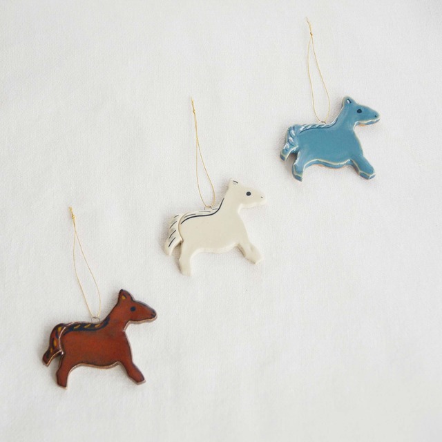 陶器で作ったオーナメント。 「うま」のかたちです。 1点ずつ手作りのため、また焼き上がりにも多少違いがございます。 ご了承いただけますと幸いです。 【サイズ】幅7~8cm / 高さ6.5cm~7cm 【素材】 陶器、紐 ※※合成漆、塗料を使って絵付けしています。小さいお子様が口に入れないようにお気をつけください。