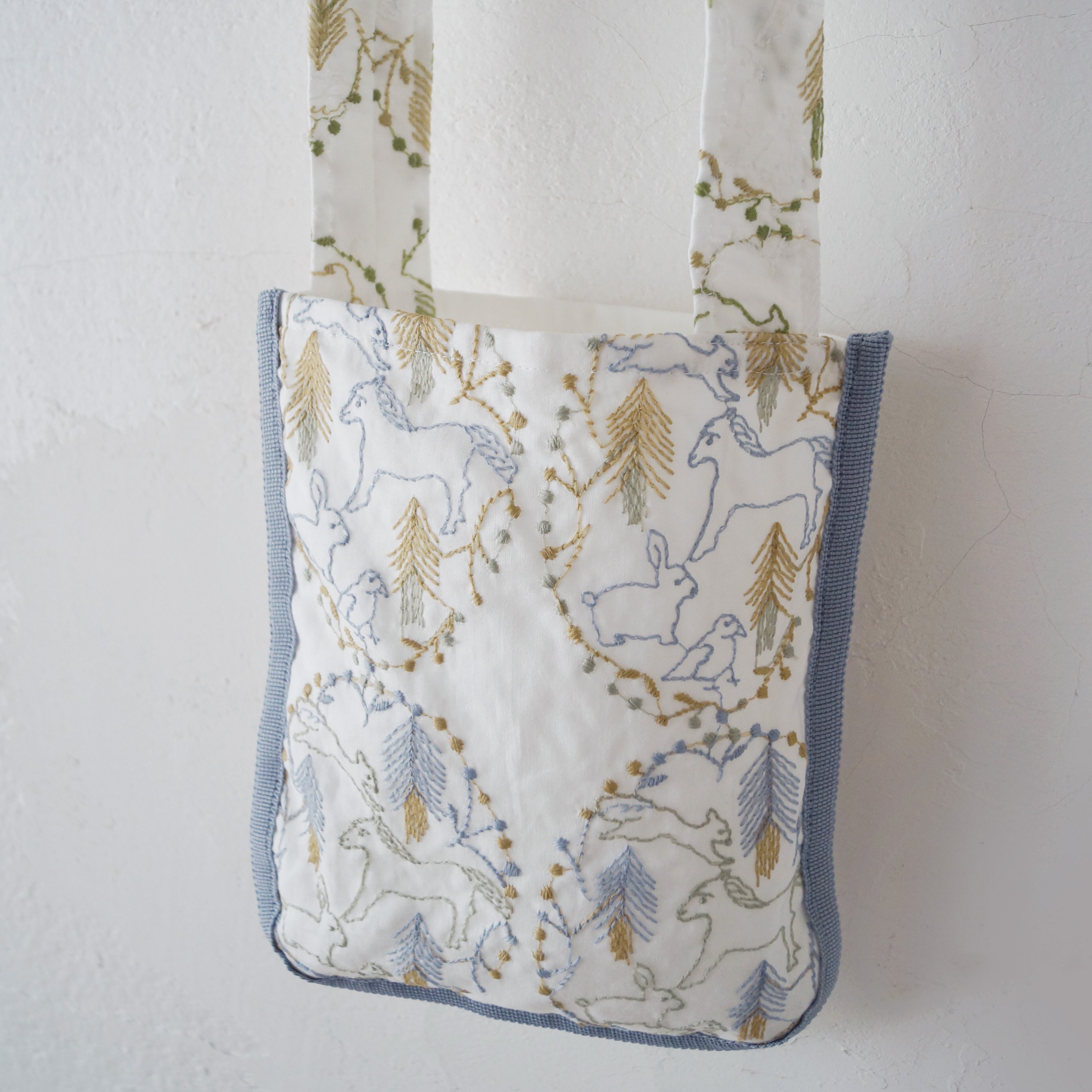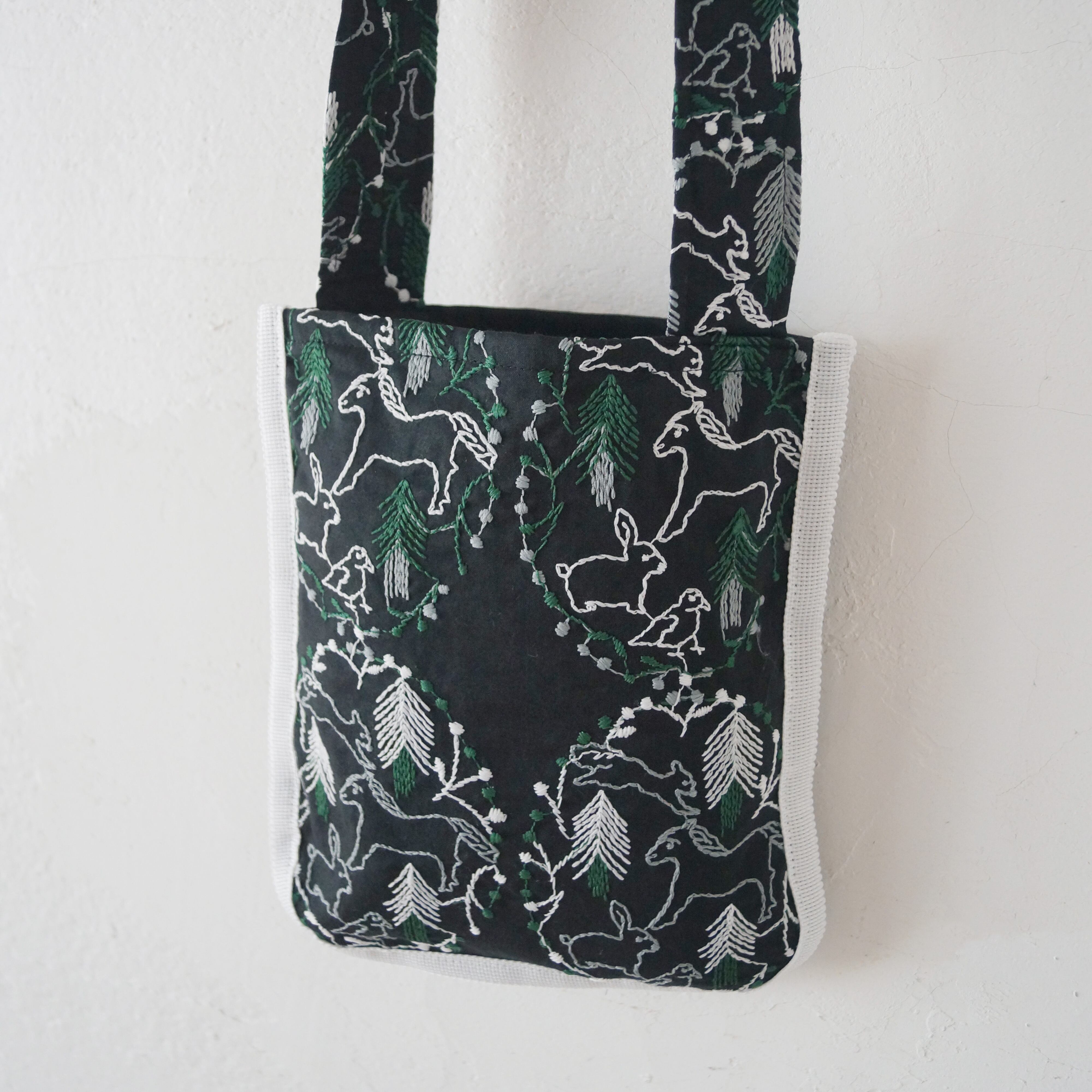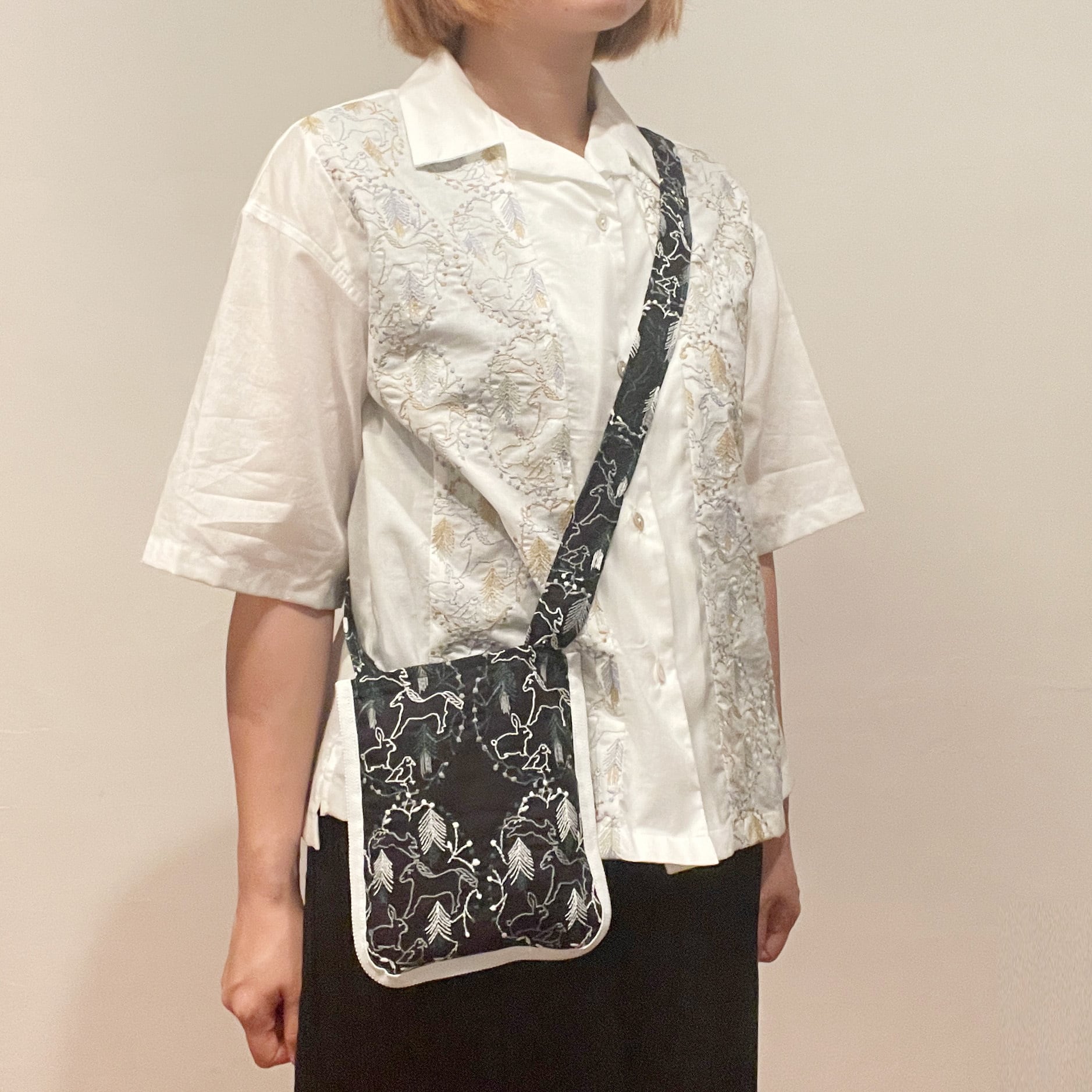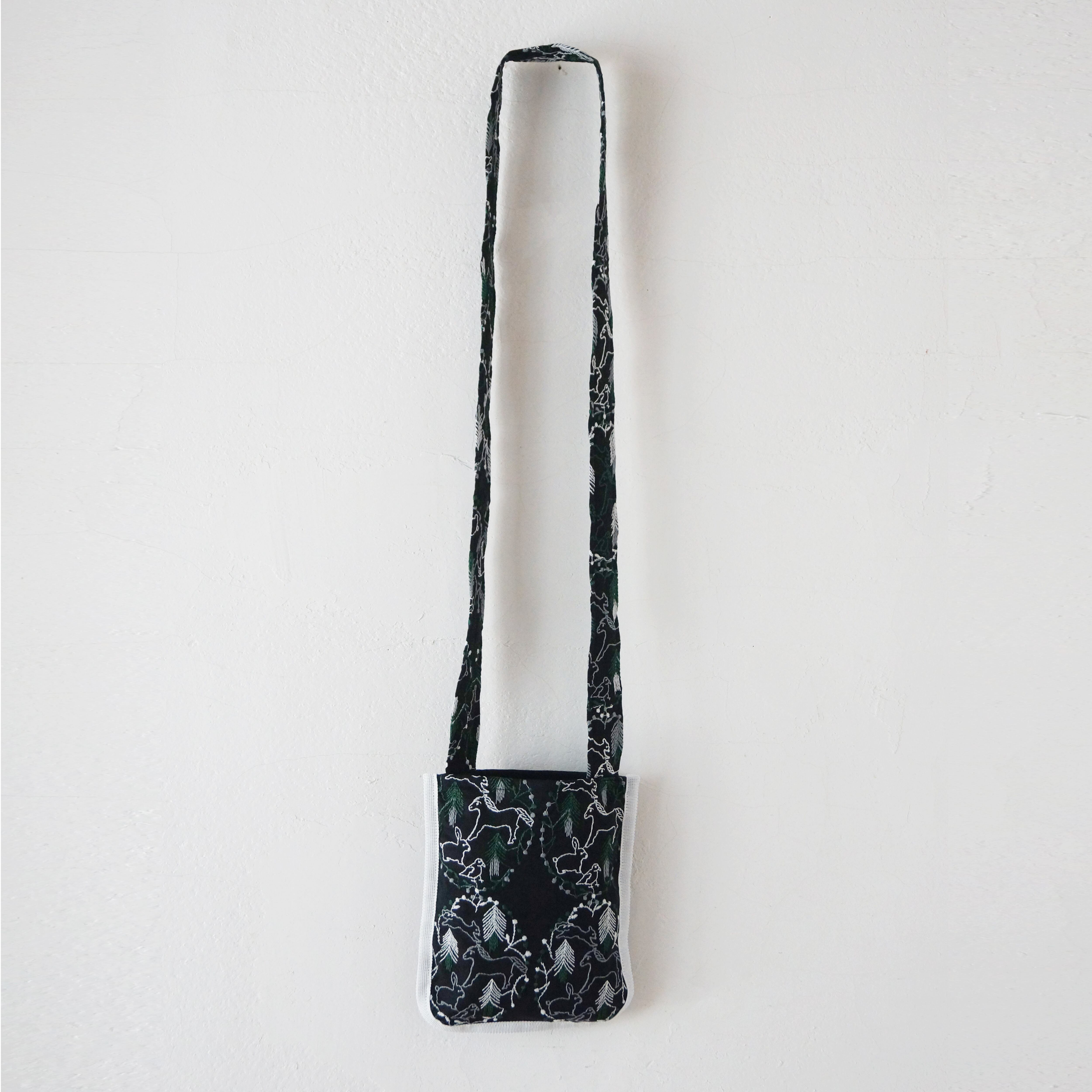 forest lakeのテキスタイルのミニショルダーバッグ。表面は刺繍生地、裏面は無地です。