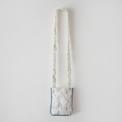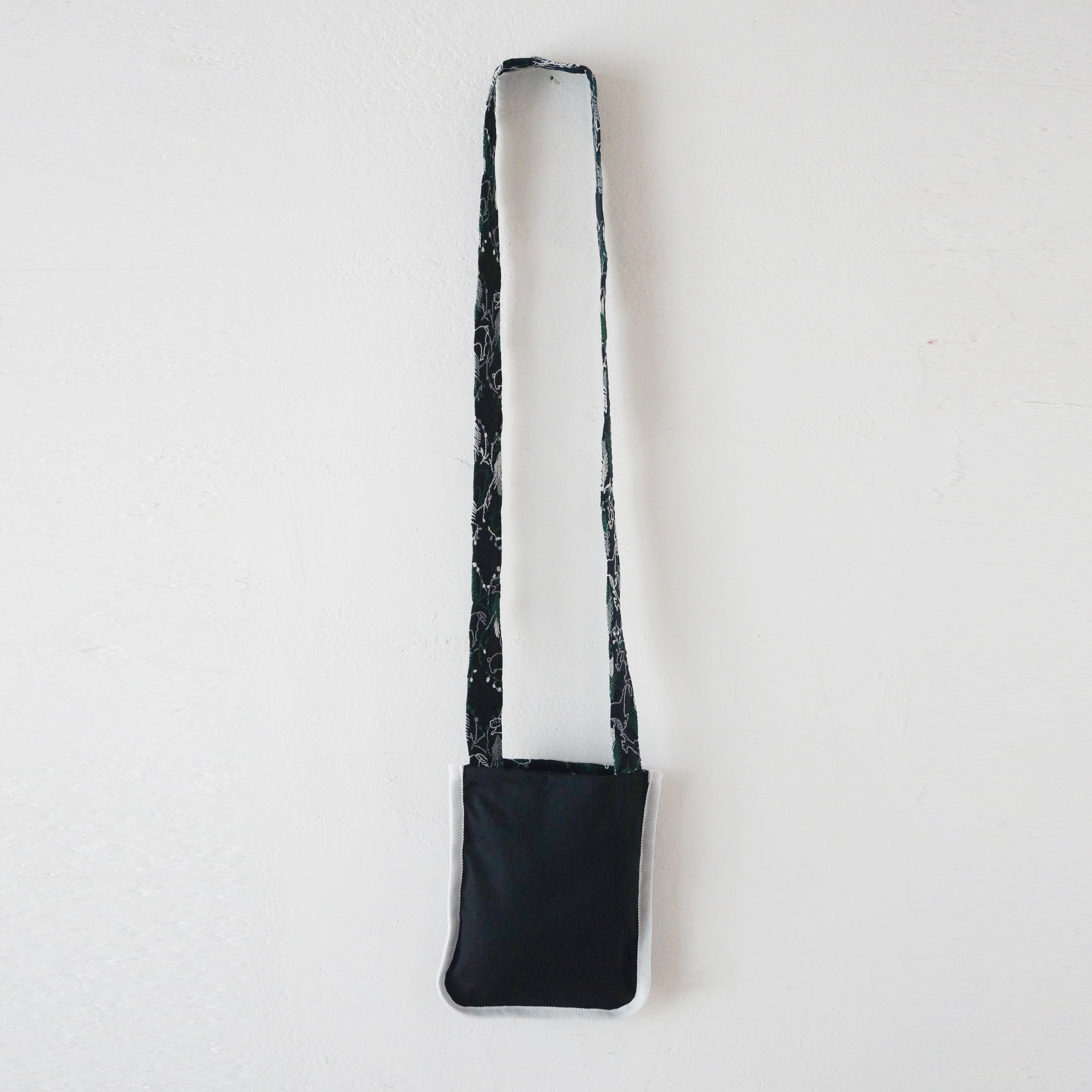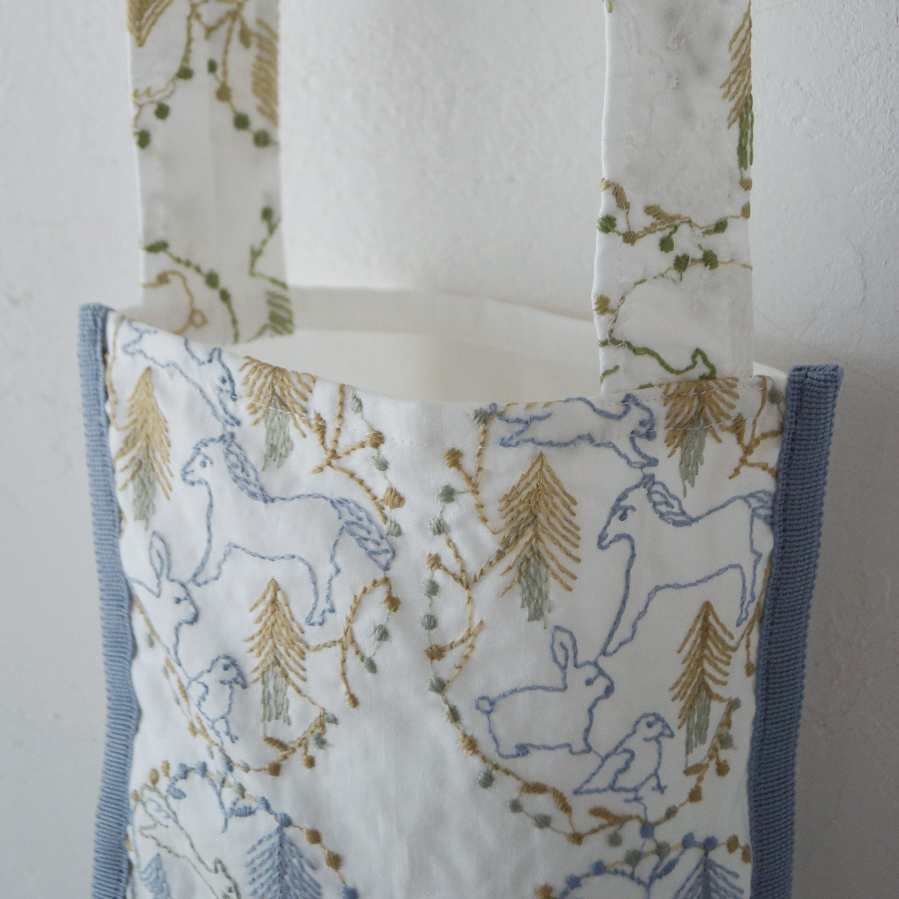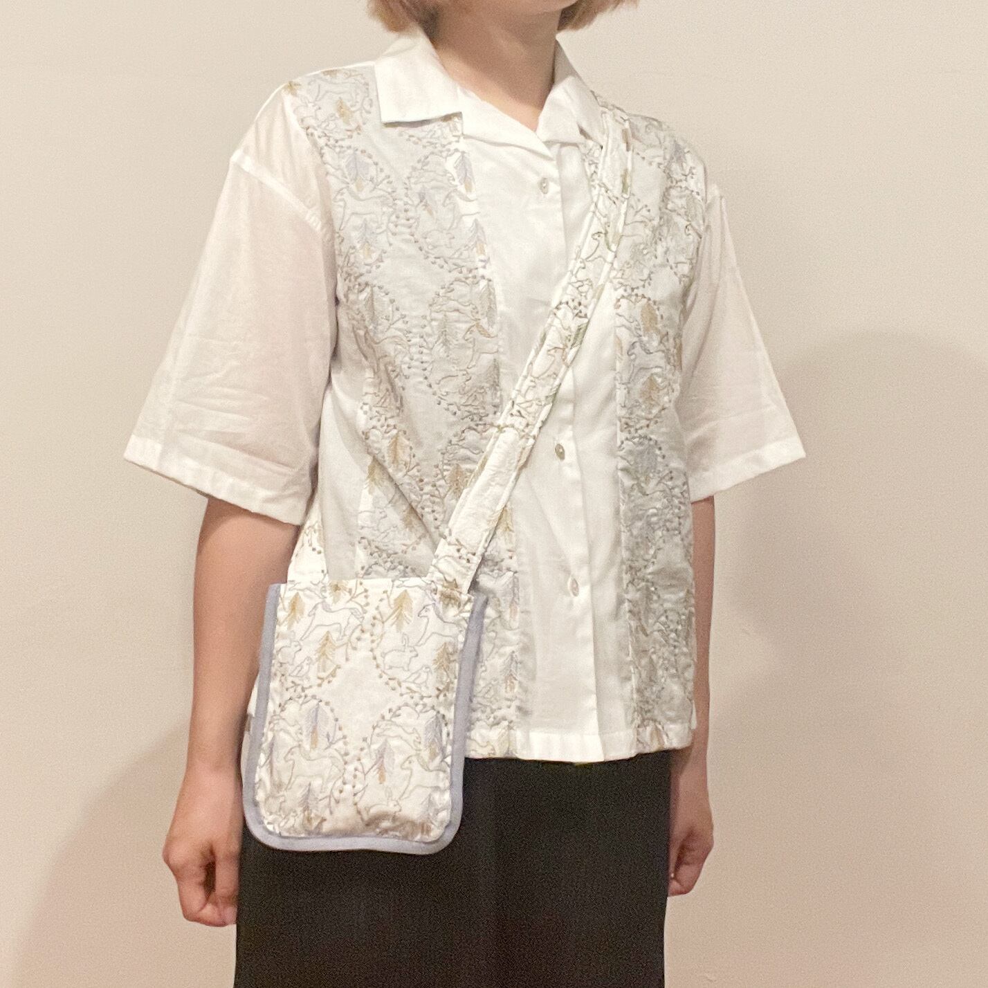 forest lakeのテキスタイルのミニショルダーバッグ。表面は刺繍生地、裏面は無地です。
