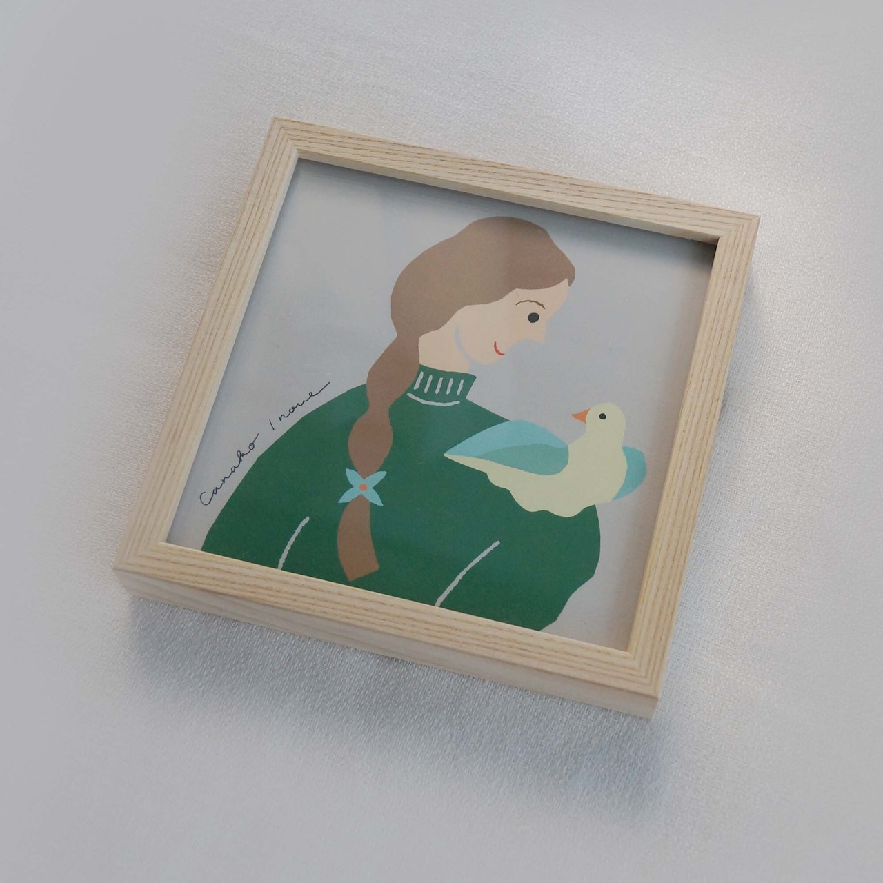 額装した状態でお送りします。15cmの小さなサイズはさまざまな場所に飾りやすい大きさです。