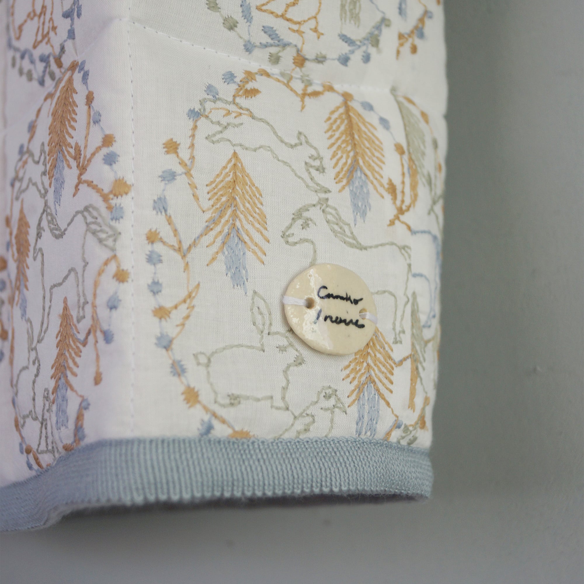 手刺繍のように見えますが、工場にて50年ほど昔からある刺繍機で機械刺繍しています。手描きの線が残るよう工場の方と何度も相談し、線のゆらぎを出すように工夫しています。
