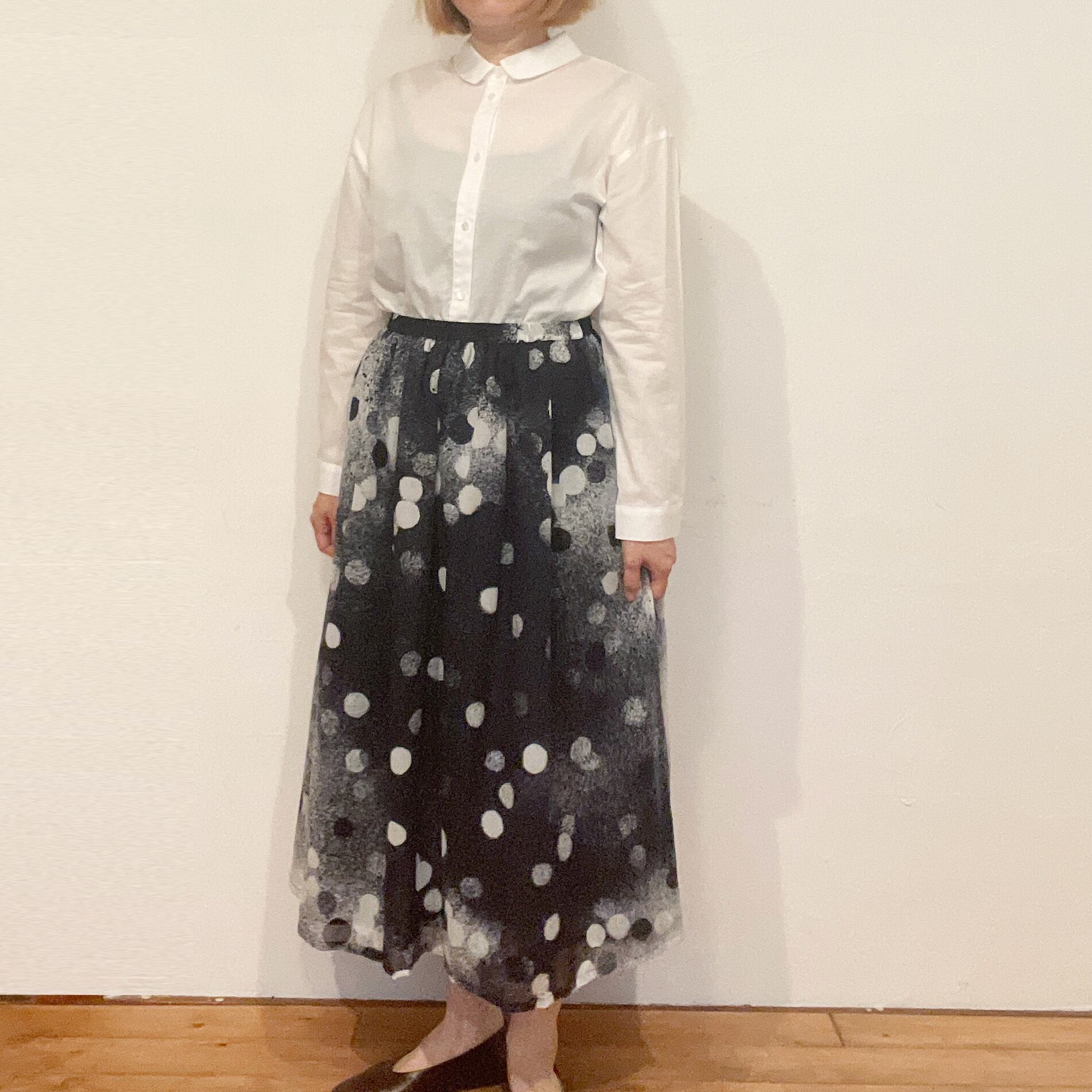 薄手の綿に手捺染でプリントした「あたたかい雪」のテキスタイルに裏地をつけ、スカートに仕立てました。