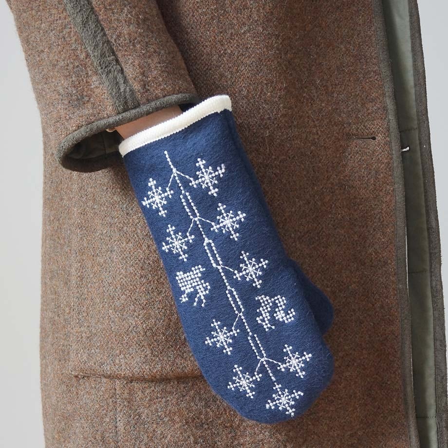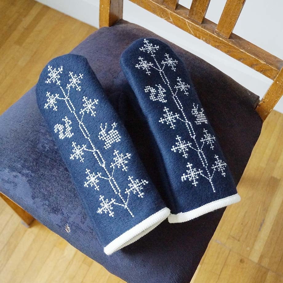 ウール生地に雪玉刺繍という模様でできています。よく見ると十字を重ねた模様が連なっています。