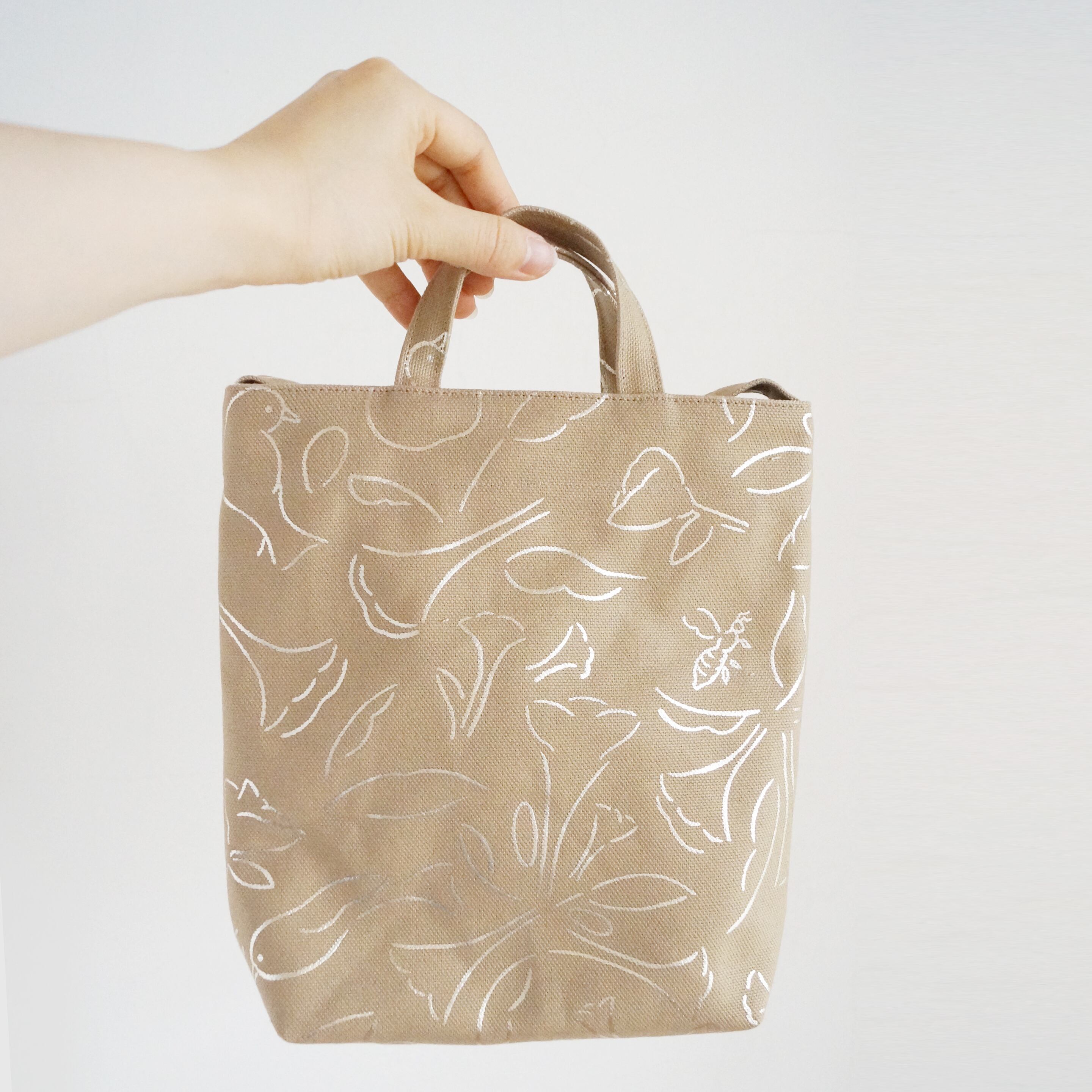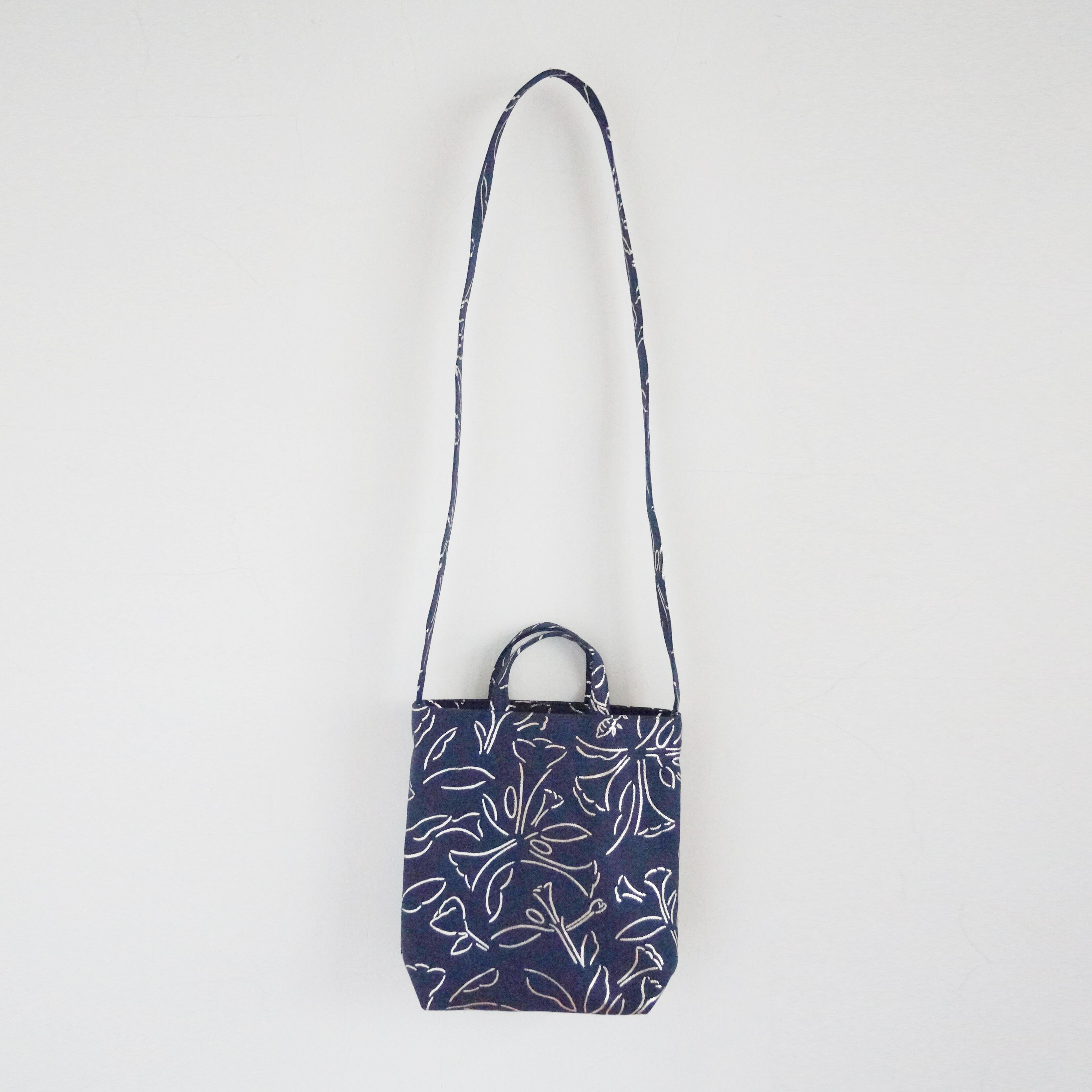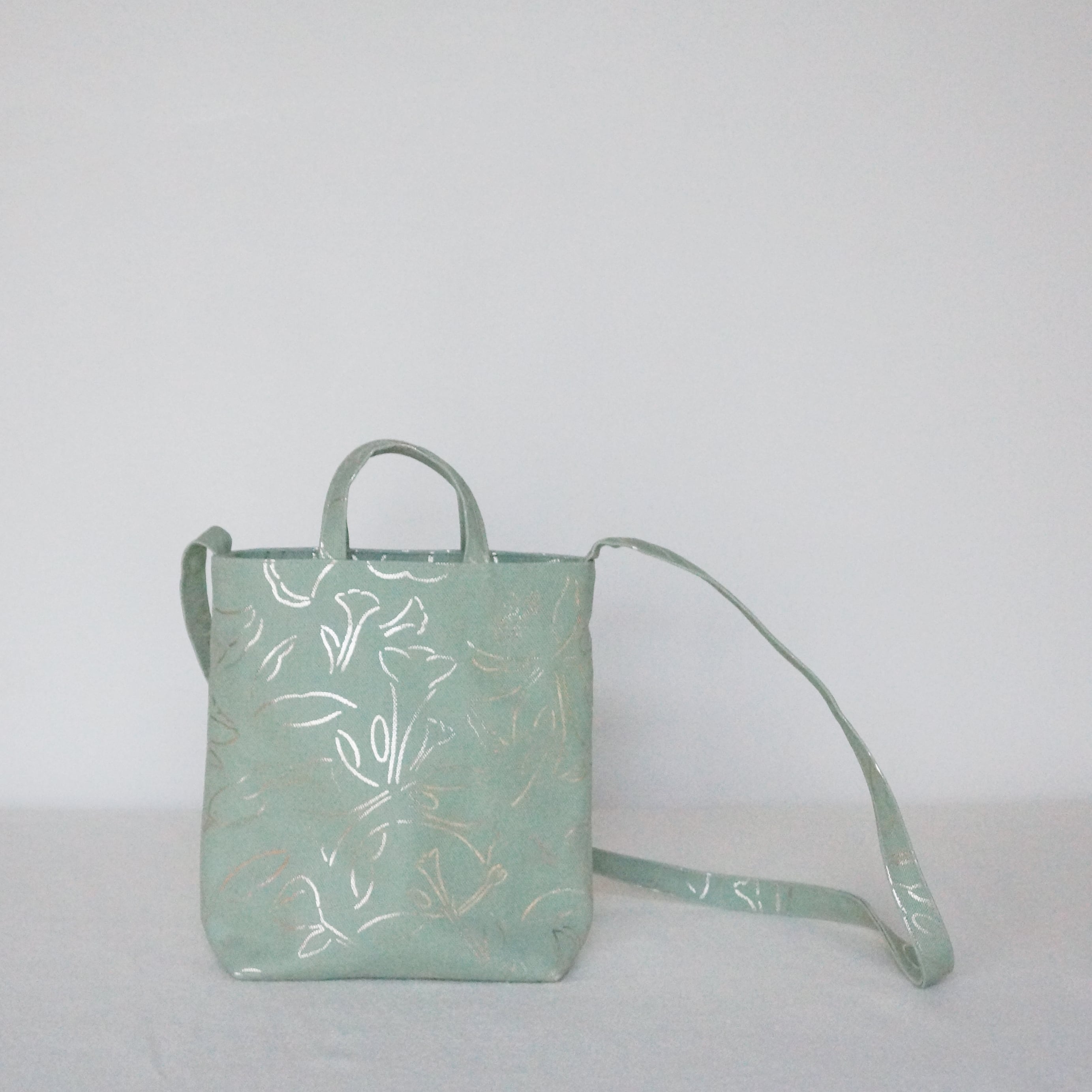 8号帆布につや消しの銀色の箔プリントを施したミニショルダーバッグ。