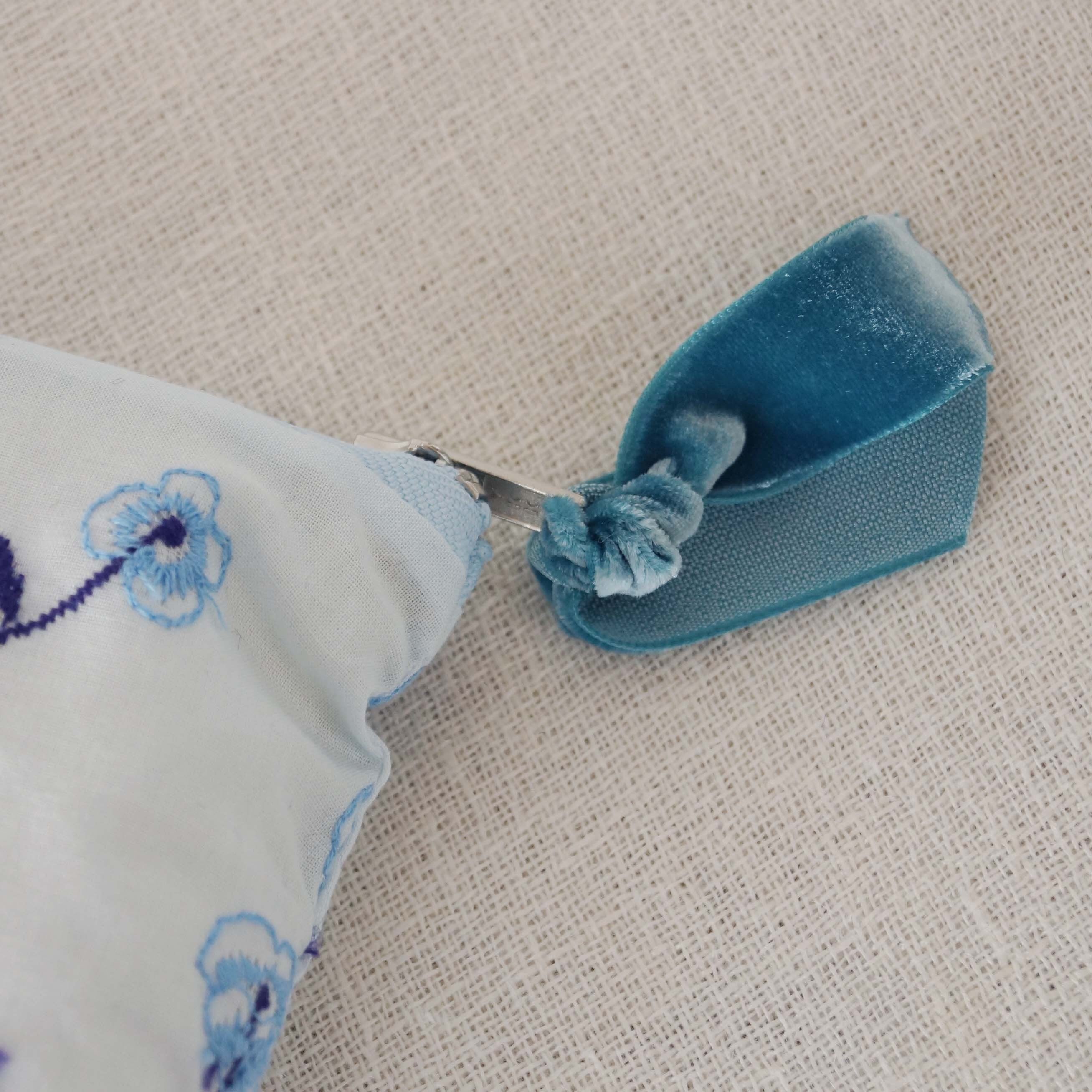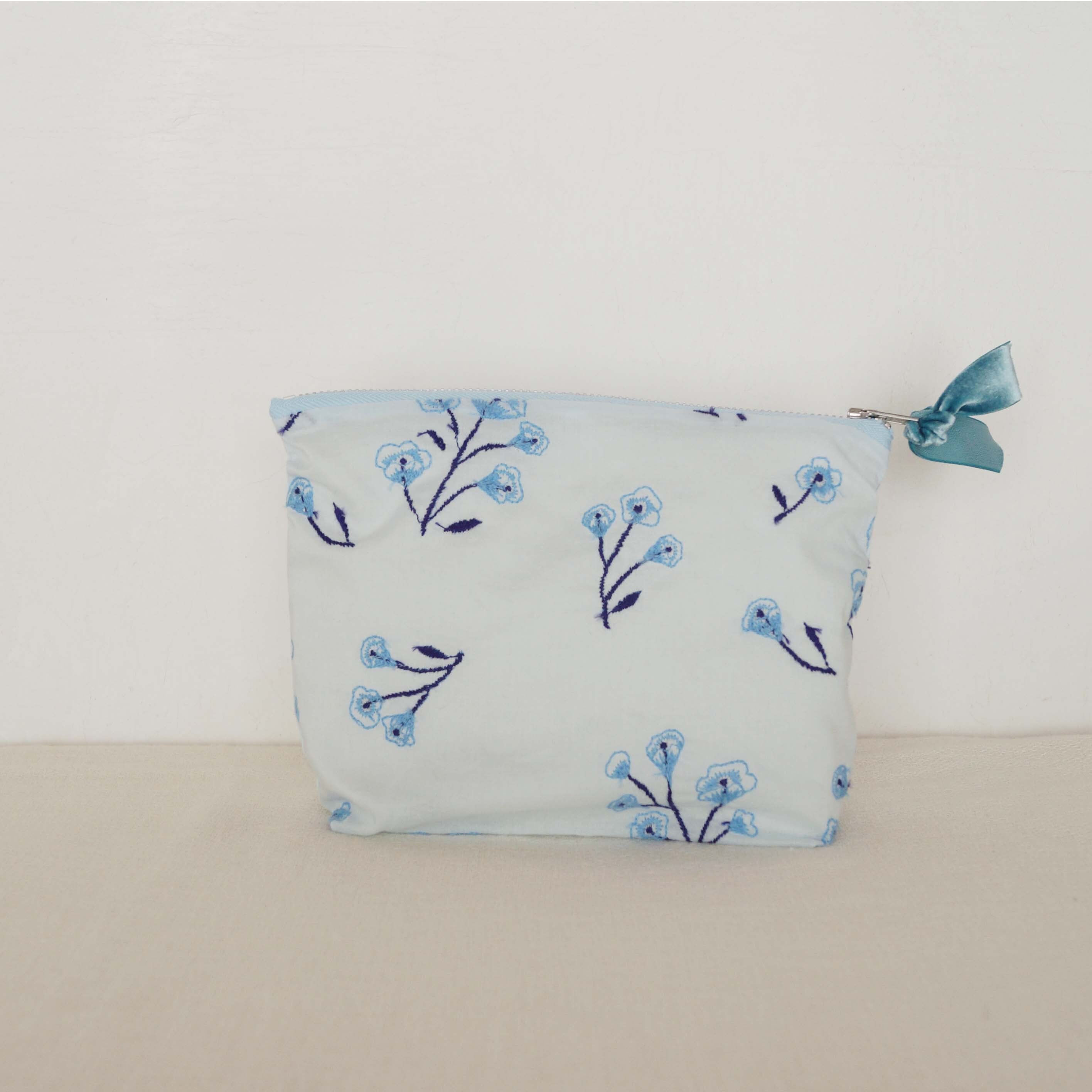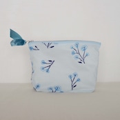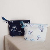 hinataのテキスタイルのポーチ。裏地つきで、内側にはロゴが縫い付けてあります。シンプルなポーチです。ベロアのリボンをファスナーの持ち手に結びました。筆記用具、化粧品等、小物を入れるのにちょうどいい大きさです。何か大切なものを入れてお使いください。