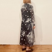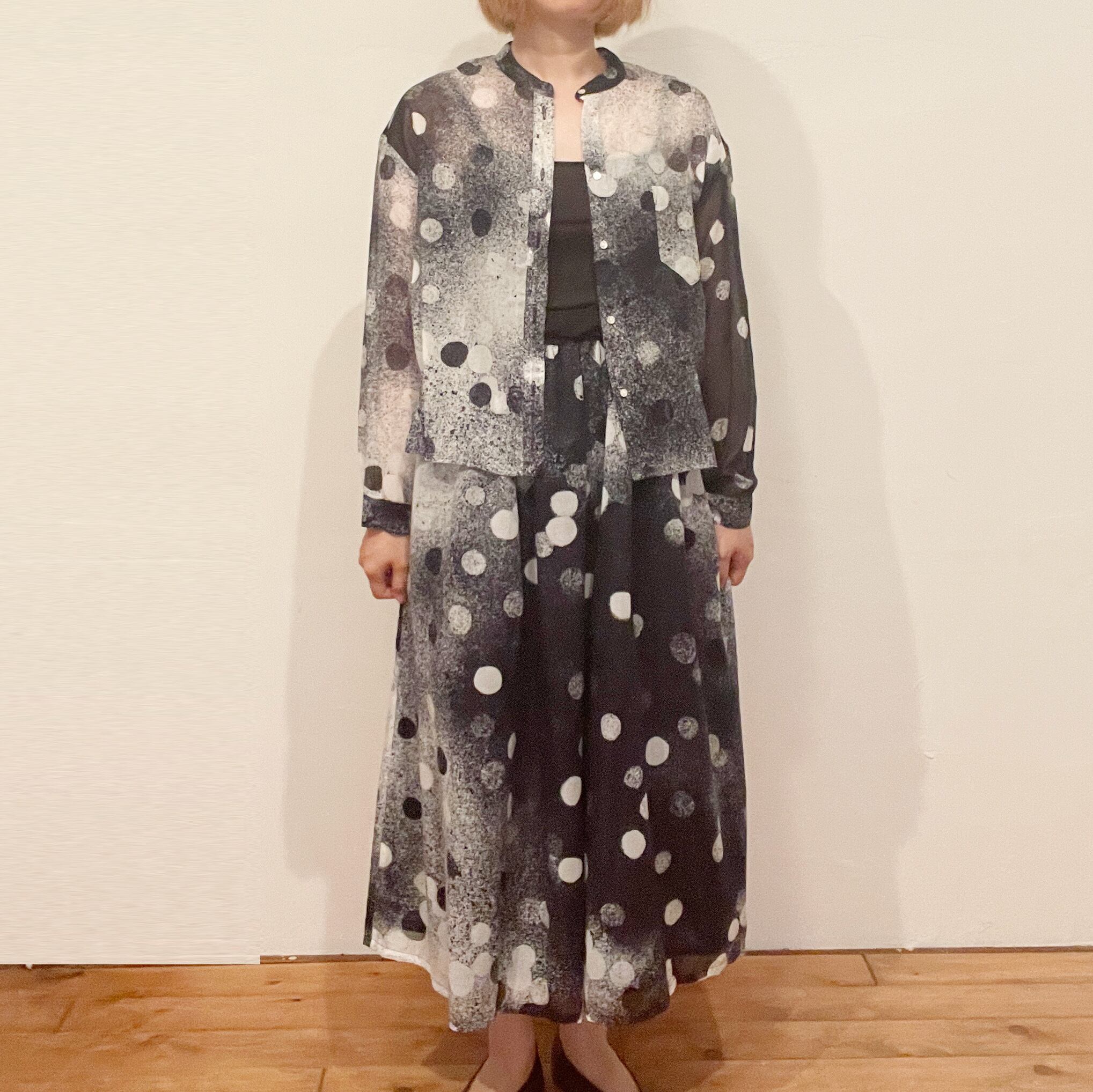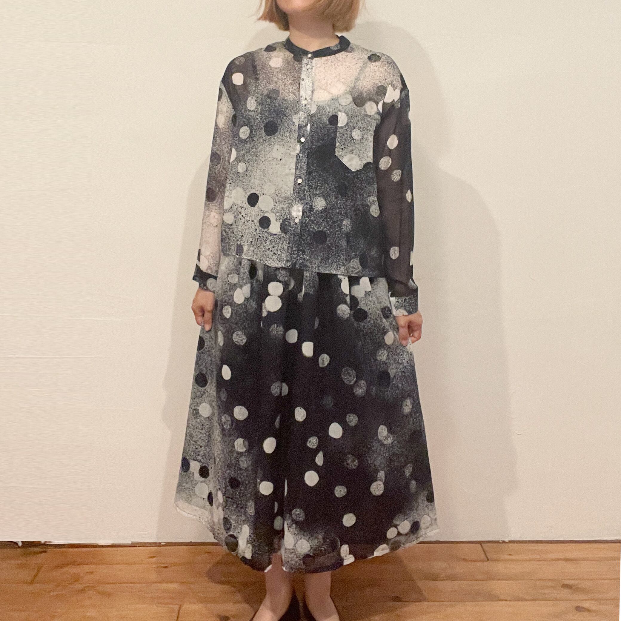 雪の降る夜に、空を見上げた時の風景を描いたテキスタイルのノーカラーシャツ。薄手の綿生地に手捺染プリントしています。夏の羽織や秋口、春先にも、幅広く着ていただけます。胸ポケット付き。小さな貝ボタンを使っています。